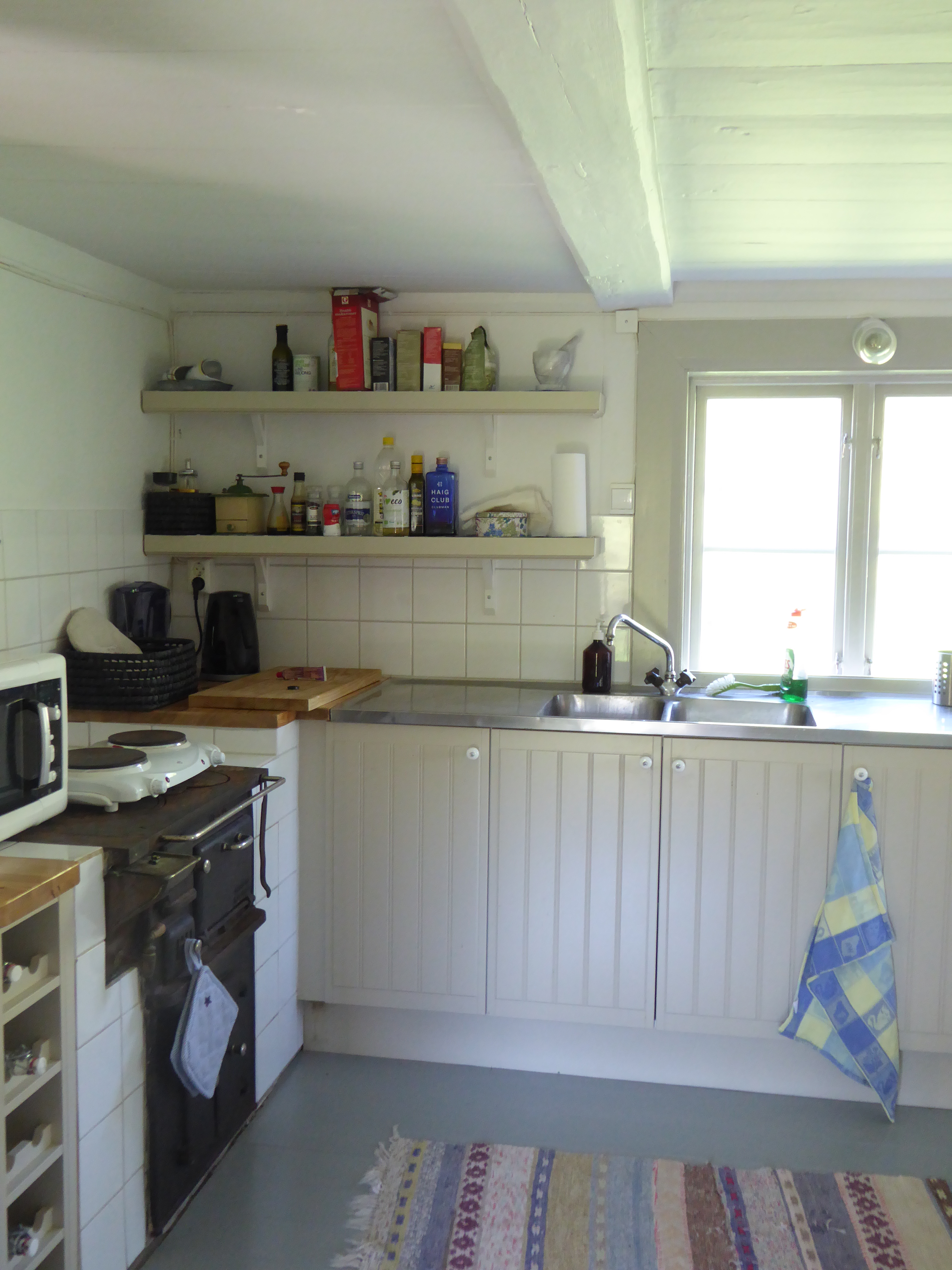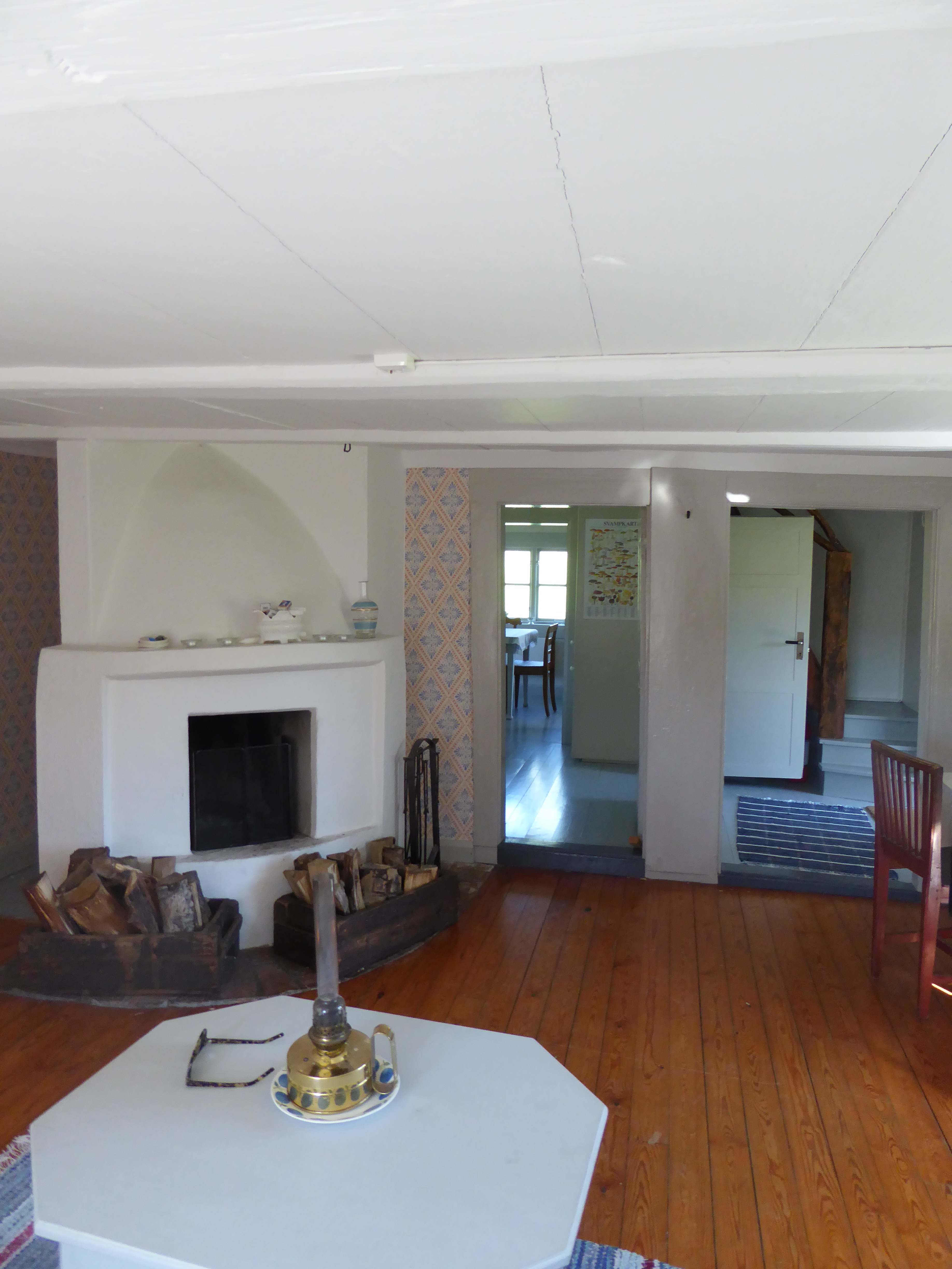 öppen spis, kök med 4 kokplattor, micro, kyl/frys, vattenkokare, matplats. Dusch/toalett.